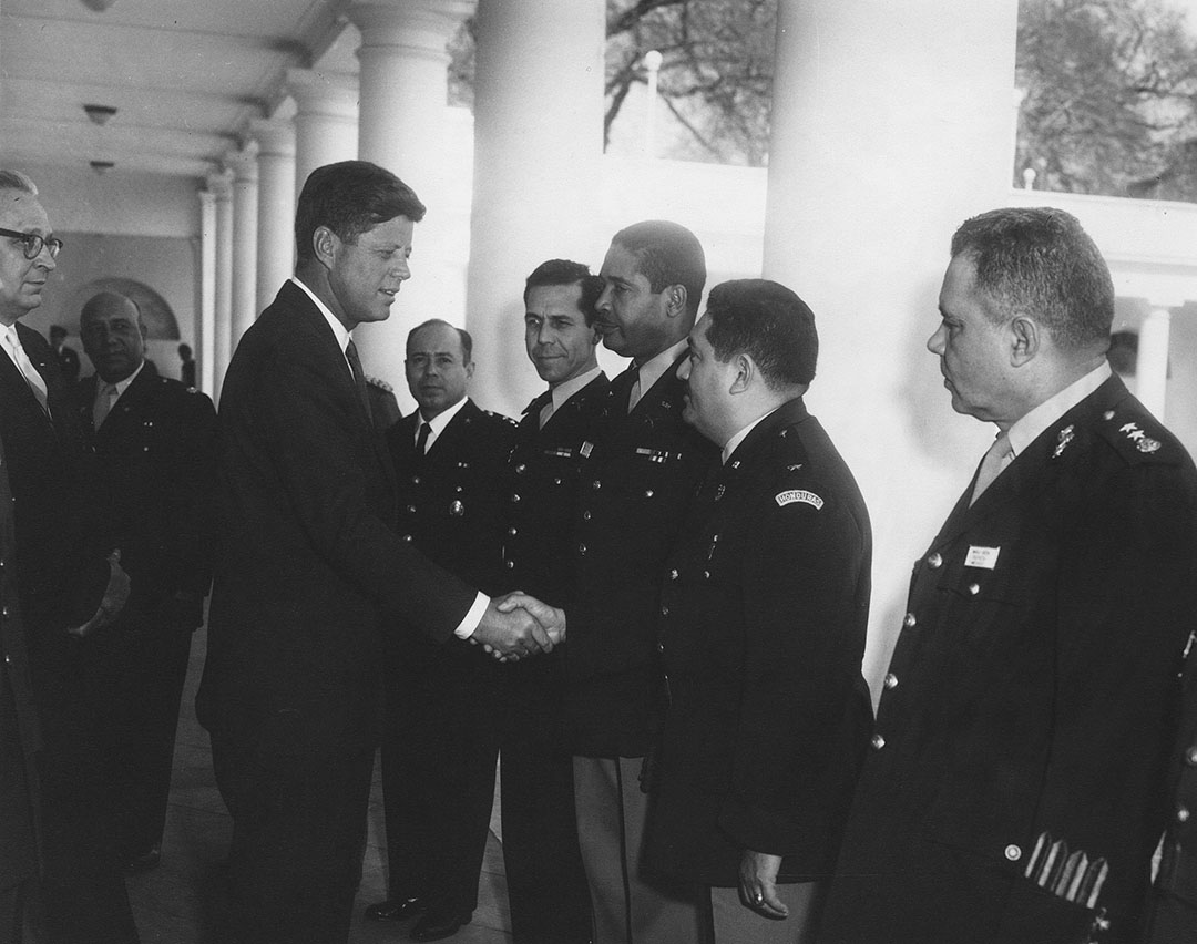 President John F. Kennedy with delegates from the Inter-American Defense Board (on the board’s 20th anniversary) in the West Wing Colonnade of the White House. Washington, D.C., March 29, 1962.